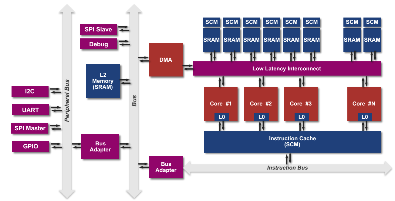 (2)共享指令缓存:多个处理器核共享一个L1指令缓存,避免了为了维护缓存一致性带来的复杂性,而且采用的是SCM(Standard Cell based Memories),可以在更低的电压下工作,从而进一步降低了功耗。</br>