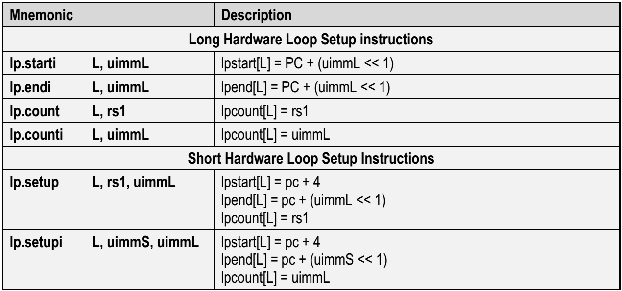 - 长指令:每条指令只能设置硬件循环属性中的一条,比如只能设置硬件循环起始地址,但是该类指令不需要紧跟着硬件循环代码段。