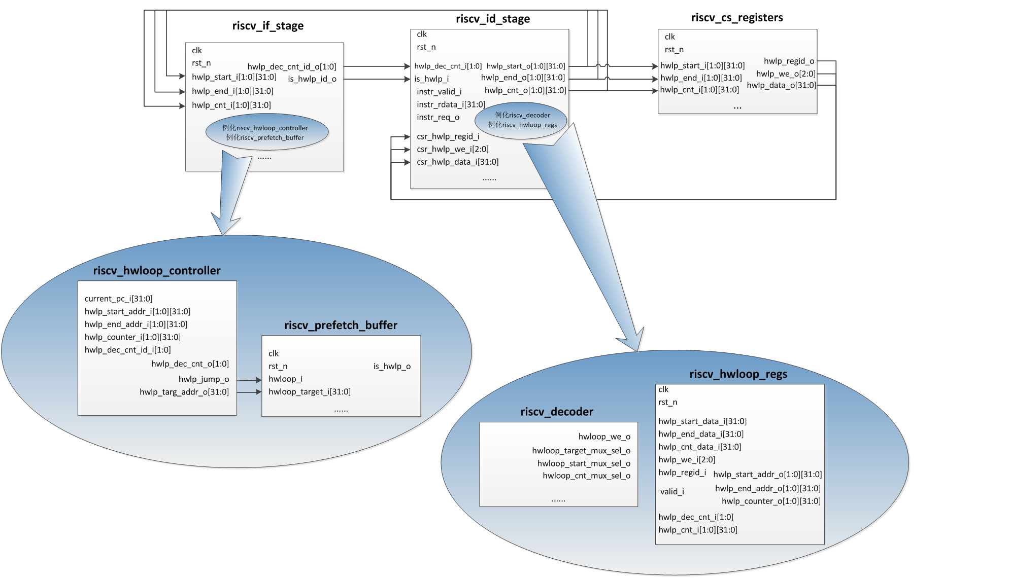 - 流水线译码阶段模块riscv_id_stage,其中例化了riscv_decoder、riscv_hwloop_regs两个与硬件循环实现有关的模块